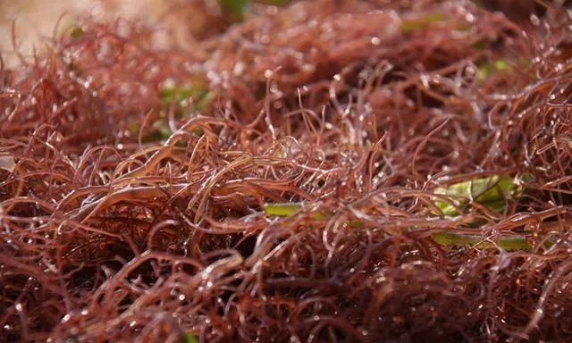 石花菜是一种分布在全球各地的红藻,它的体色有红色、紫色、绿色等多种变化。石花菜的特点是它的细胞壁含有大量的石灰质,使其表面坚硬而光滑,像一块块小石头。石花菜可以附着在岩石、珊瑚等硬质基质上,形成美丽的景观。石花菜也是一种可食用的海藻,富含钙、碘、铁等微量元素,有利于人体健康。